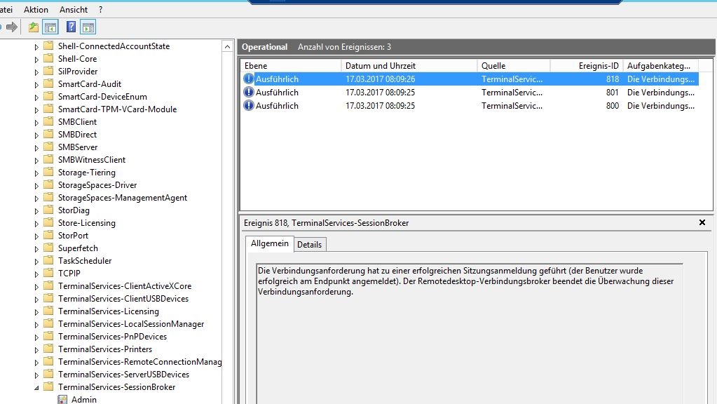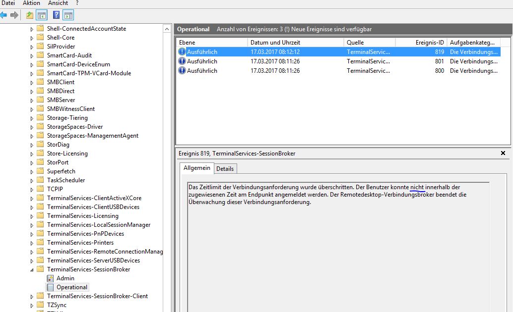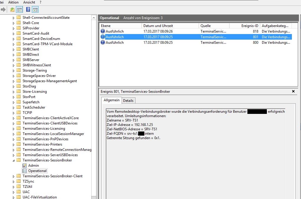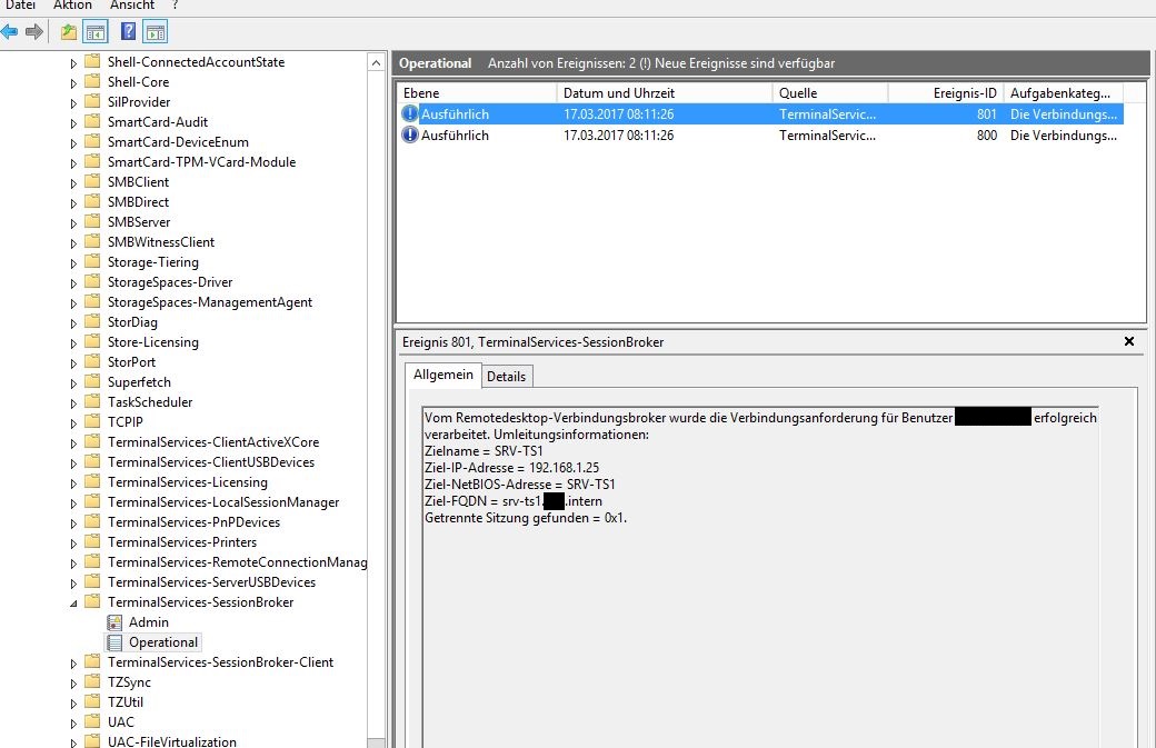2. Versuche ich nun eine RDP Verbindung mit "TSFARM.domain.intern" habe ich eine 50/50 Chance das es klappt. Wenn es nicht klappt bekomme ich die Fehlermeldung "Ein interner Fehler ist aufgetreten"