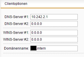 In den erweiterten Einstellungen habe ich eingestellt, dass der DNS-Server 192.168.1.21 und der Domain Name "domain.intern" verwendet werden soll.
