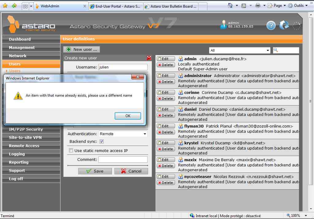I'm using authentification against Active Directory, which is working fine, except when you delete a user that was previously automaticaly created by Astaro when logging on the end user portail.