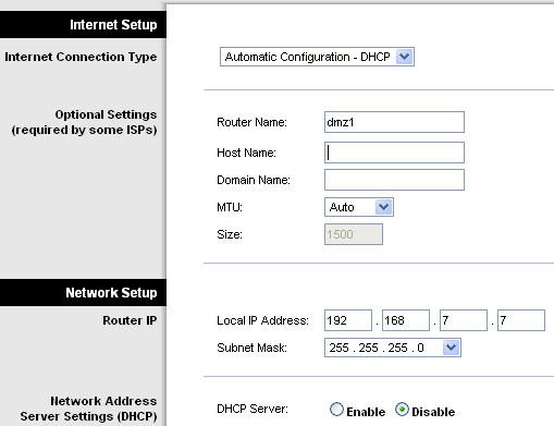 • There are two parts of the linksys setup: Internet Setup: which is configured for DHCP and NetworkSetup: Which has a static IP for the router.  See attached JPG of linksys screenshot showing this.