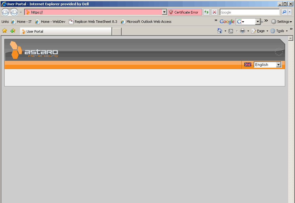 We are having real problems on our ASG320 and access to the user portal. We are running 7.301. It seems that every time a user tries to log in now, they get a blank screen with the top Astaro banner and a drop down for the language, and pretty much nothing else. No links. No tabs, no nothing.