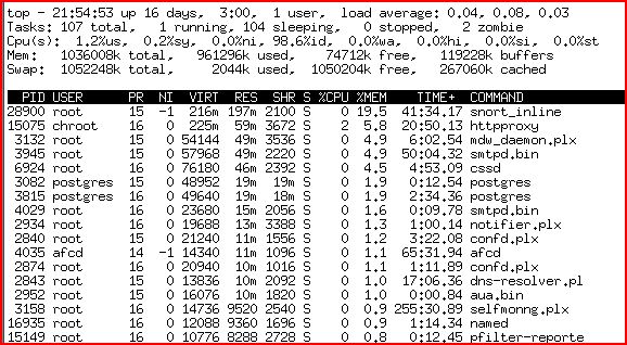 All in all, on a server, with a fast enough processor and a few megs of swap, you probably won't notice the difference as much as you would on a workstation so I just quit obsessing about it. Otherwise at one time, I was taking drastic measures by running swapoff/swapon as cron jobs right before everybody got to the office just to load the swap back in memory[:D] I know not the best idea but it does work. By the way here is my top and as you can see after 16 days, its still only swapping around 2megs with IPS, single AV http proxy, mail av proxy, and vpn.