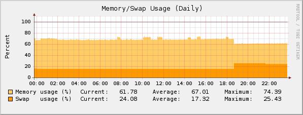 -2- Why didn't the 6:40 run cause everything swappable to be moved out to the swap file? And, why did the 18:40 run only begin to cause swapping on Tuesday (7/28) after weeks without so doing? This indicates to me that some space in the swap is not being released and/or swapped back in when the database maintenance is finished.