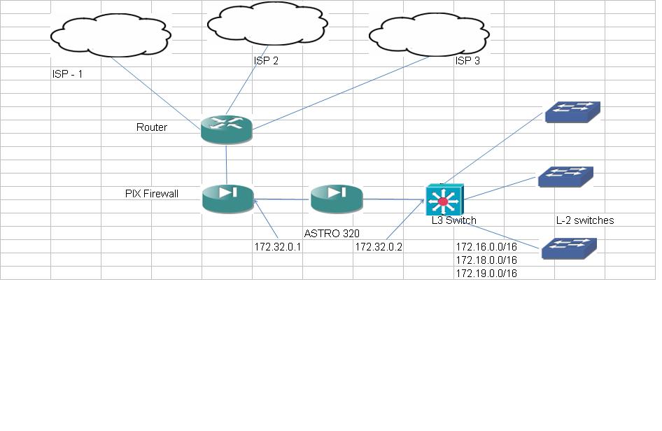 PIX firewall with internal ip address as 172.32.0.1/16. Pix firewall is connected to L3 Switch (3750) whose port (connected to PIX)has ip address is 172.32.0.2