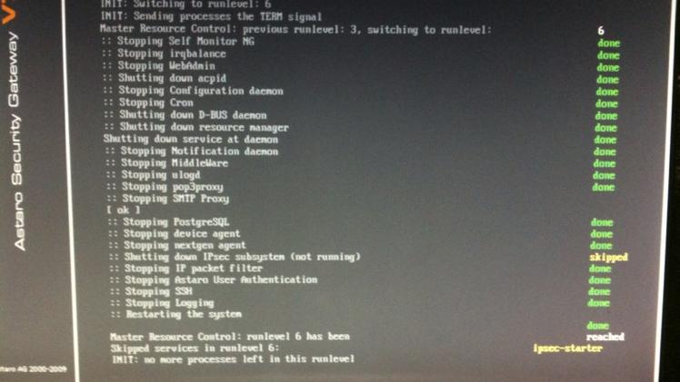 Whenever I try to reboot my astaro box (running on an supermicro atom 330 server) it hangs as can be see in the attached image.  This is a fresh install of 7.5 and was not an issue until I configured the box.  I tried updated to the latest stable via up2date and I have the same issues.