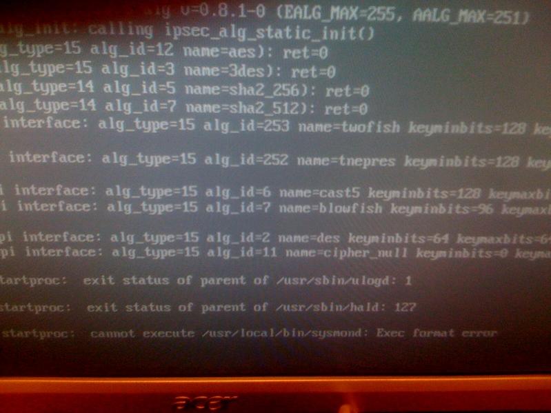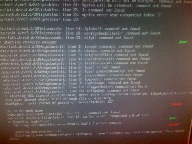 • Since I cannot access the slave anymore I thoguht I might add a photo of the screen. It seems like the startup scripts have been mangled. It complains about not getting postgresql started, bad password in one startup script, all the services failed on run level 3 etc. etc. etc.
