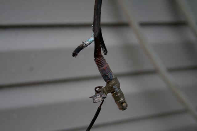 • A "GOOD" arrestor would have helped(maybe). Any protection is better than none but in this case a direct stike is hard to control. Here is a pic of the coax and the cheap grounding block the cable company uses. The small wire(14 gauge) was the ground bonded directly to the service ground was burned in two as well.