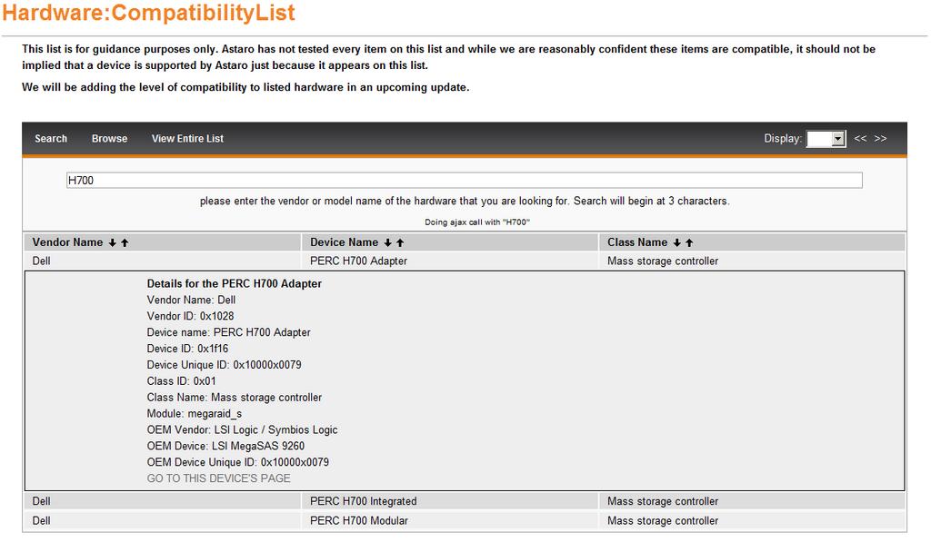 • I just looked at the most recent version of the HCL for V7, located at http://www.astaro.com/lists/HCL-ASG-V7.txt, dated 11 May 10. There's no reference to a Dell R310 or the PERC H700. The R610 is on there, but only with the PERC 6/i. Are you certain that your not accidentally looking at an HCL for the V8beta? The one with ajax enabled search on the new knowledgebase mostly applies to V8, not V7.