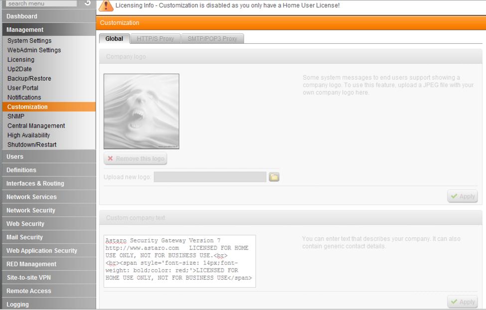 I installed the v8 beta when it was v7.902 and upgraded through out the beta periode until I know went from v7.951 to v8.000. I know customization was disabled for Home License sometime in the beta periode, but I had already uploaded an image for testing the logo customization. Now that the feature is locked for me and my home lic, I still have the picture, but I can't reset or change it. It also says Astaro v7 etc in the textfield.