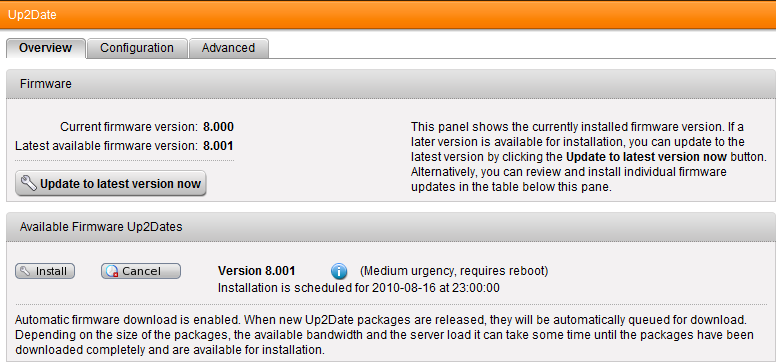 Yesterday at around 10:00 I scheduled the install of the 8.001 update for later the same day (23:00) - see attached image.   This morning, I found that the update had not been applied, and still showed up as being scheduled for last night.  I had the same issue on 7.5xx prior to installing 8.000, but didn't look too deeply into the issue at the time.  I was surprised that it also didn't work last night on 8.000 -> 8.001.  I am using an ASG 110 with the 8.000 software appliance installed, and a home user license.