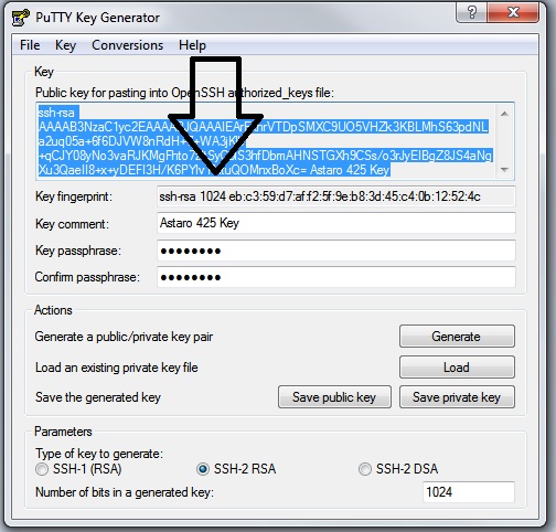 1)  In Puttygen, I generated a key pair- ssh-2 RSA 1024 bit.  Added the passphrase and saved the private key file.