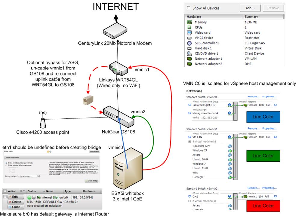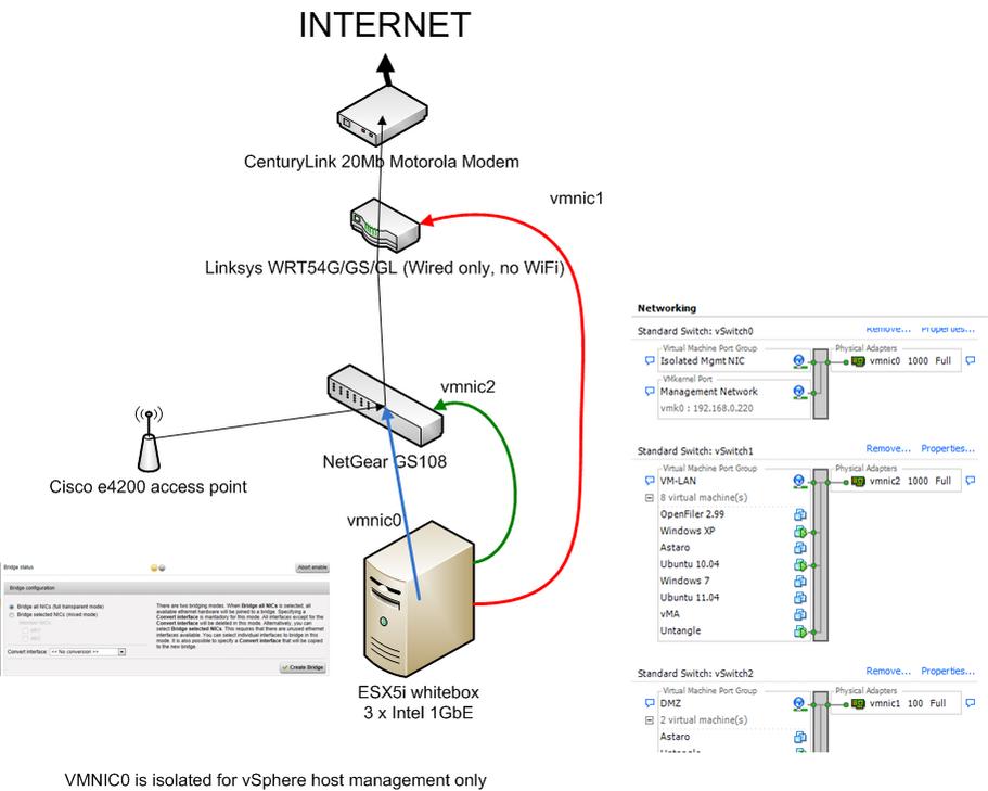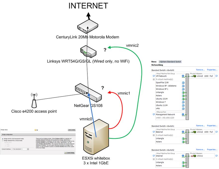• Ok, I made some changes to my network.  I moved all my VMs to a VMswitch called "LAN".  I left only the vSphere management host IP on vSwitch0.  Then, I configured a second vSwitch called "external/DMZ" and placed a second Intel NIC on this switch.