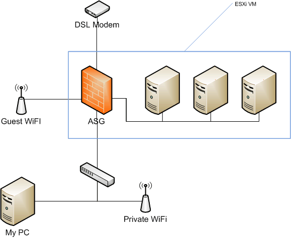 I am trying to get Astaro networking working on my existing ESXi system.  My goal is to use ASG behind my existing wired router to get some of the usage logging and reporting about my home network (I have a few family and friends that use it frequently).