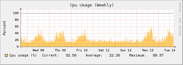 • Here's the weekly CPU graph for my customer with 85 employees and 111 active IPs running Web Proxy (AD-SSO & some Transparent) and Intrusion Prevention.  This is a 220, not a 320, but is V7.511.