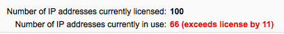 After uprading, the new 100 was there and 66 used but the (license exceeded by 11) was still there.