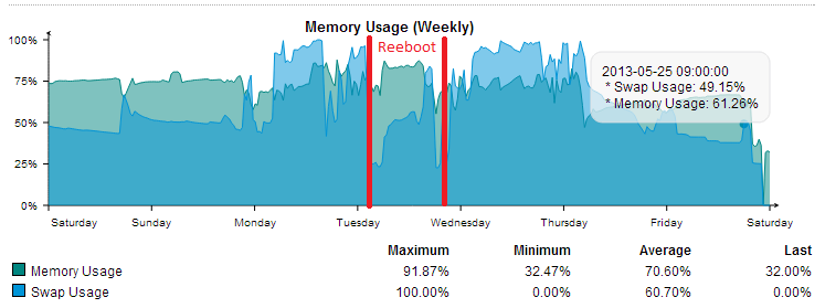 • 120v5 - After the 9.1 Up2Date, swap grew to 46% in a little more than six days and is now nearly 60%.  Under 9.006-5, swap grew to 100% in fifteen days.