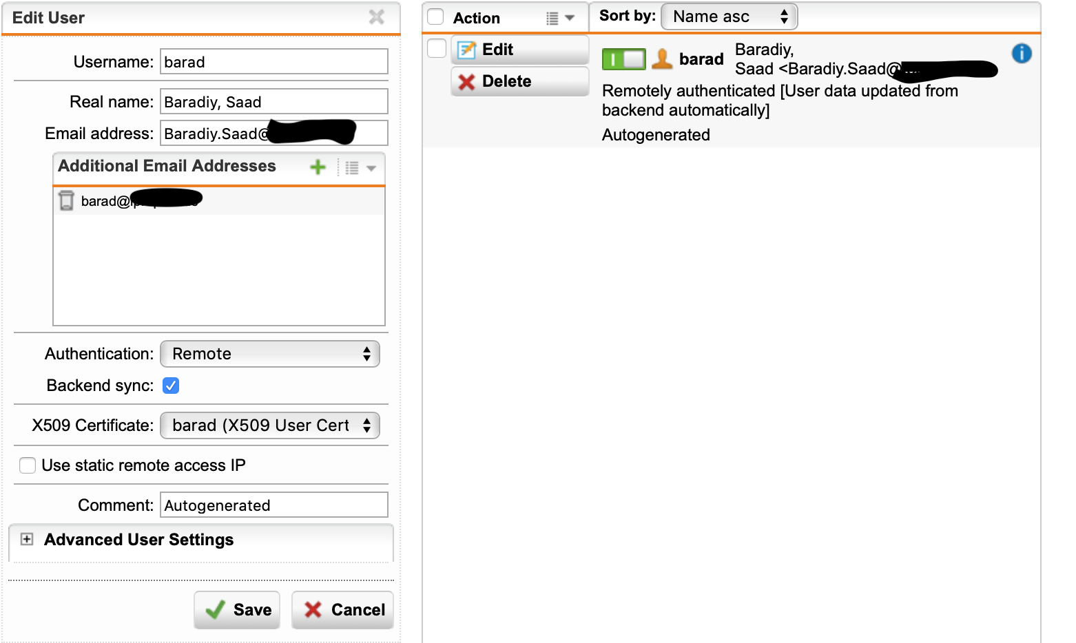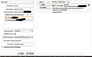 For additional email addresses, all email addresses are entered (comes through AD authentication) However, as soon as the user logs in, the optional email address dr.surname.givenname@domain.com disappears from the Webadmin Portal Additional Emailaddress.