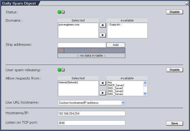 [FONT=Times New Roman][SIZE=3]I am having trouble getting the Daily Spam Digest to work in the Proxy content Manager. We retrieve our emails via our ISP through a standard POP3 setup, and we also have an internal Exchange Server. I have tried using both our ISP’s MX records and ours. [/SIZE][/FONT]