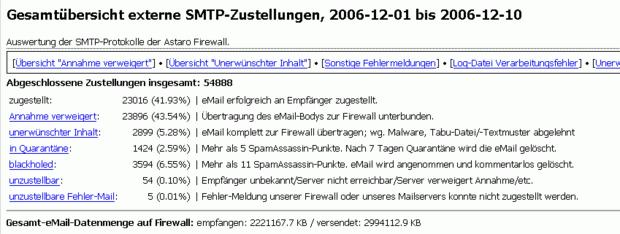 is there a way to dertermine how many messages are actually considered spam received by ASL. In the reports I can only find an average spamscore. But for our management reports I need a % total spam of total number of received messages.