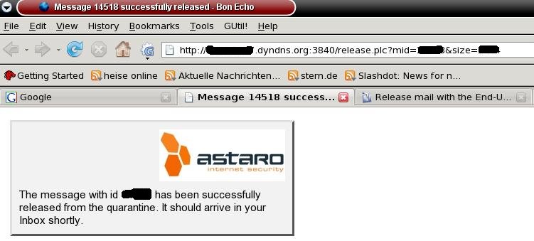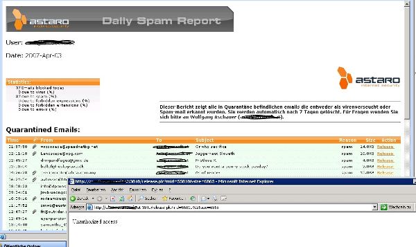 When I try to release a mail with the End-User Spam Report from the outside of my ASG I get an "Unauthorized access" message in the browser