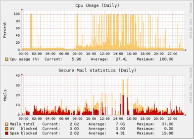 See the attached image of the CPU chart lined up with the Secure Mail chart from my daily report yesterday.  As you can see when the system spikes, it appears that email stops flowing.
