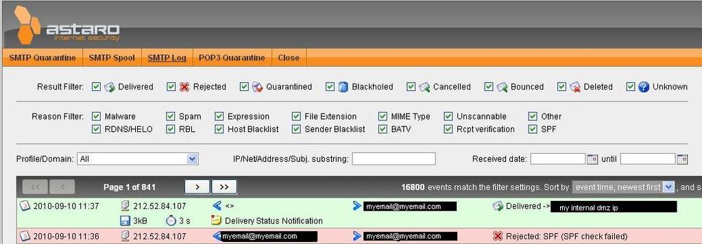 today I have tested SPF filter in Astaro. So I have used a remote client that uses a SMTP server NOT listed in my SPF record. I have configured the client with my company email address as sender (ie myemail@myemail.com). So I have sent an email from myemail@myemail.com to myemail@myemail.com.