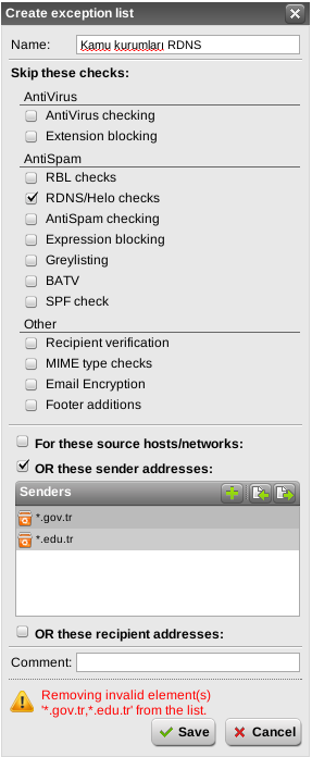 I want to create filter exceptions for top domains like *.edu.tr ,*.gov.tr. As I understand astaro can't use RegEx in SMTP filters; I tried *\.edu\.tr but when I tried to save it complained for invalid elements. Trying "*.edu.tr" gave the same error. The only working filter seems "*@example.edu.tr" but this is not what I want.