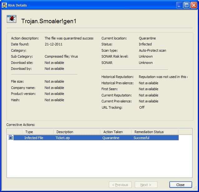 In a protected environment I did check out the zip and discovered it contained a Trojan.Smoaler!gen1 the installed Symantec AV happily quarantined.