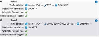 I am trying to connect externally to a Vsftpd linux server behind a Sophos UTM9 on a lan .  See below DNATS and Firewall rule