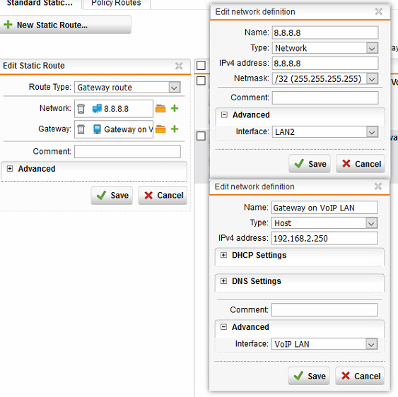 • I disabled WAN, I just set 8.8.8.8 for test, but am I saying in the picture that 8.8.8.8 is routed to lan2 or I'm saying route 8.8.8.8 on interface lan2 to 192.168.2.250 on interface VoIP LAN?