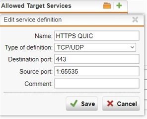 • Agreed with the MoD, but I also prefer to add UDP 443 to the 'Allowed Target Services' in Web Filtering. That allows browsers using the explicit proxy to benefit from the increased throughput of https over UDP.   Using this means that you have the block as mod prescribes and the Anti-UDP Flooding Exception as described above.  In any case, there's no reason to open UDP 443 inbound.