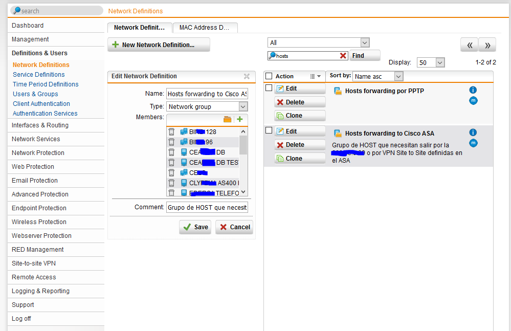 there is a list of networks and hosts that have to be routed through the ASA, all of which defined in a group in the UTM