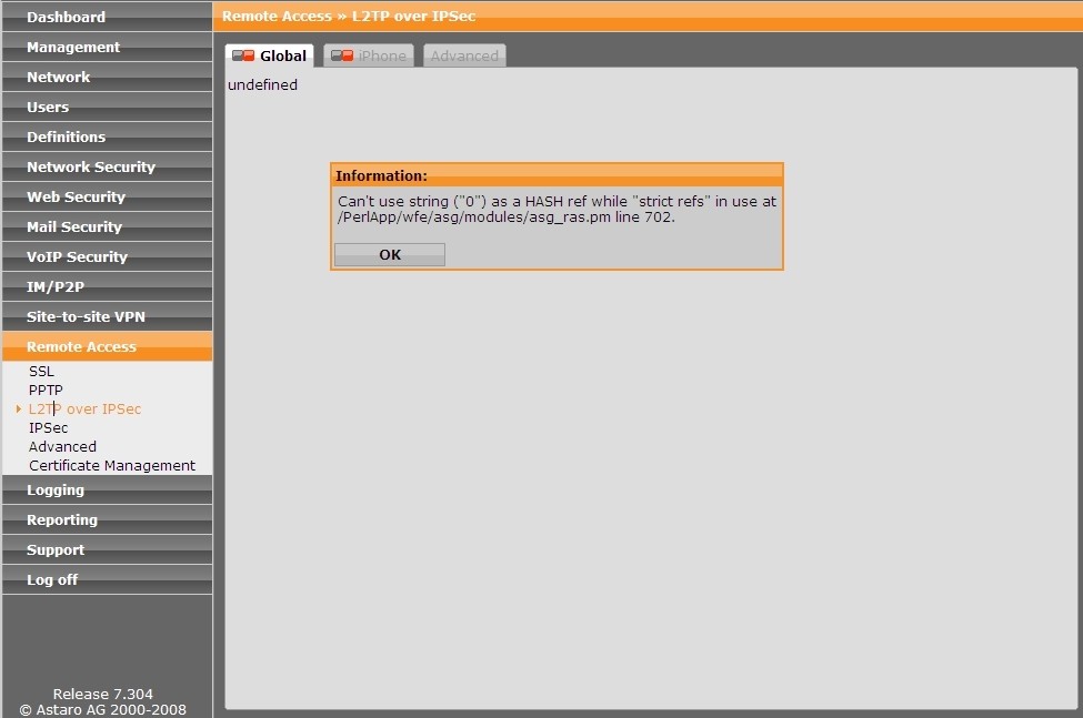 after updating from 7.2 to 7.304 on my ASL testing device I get this error in "Remote Access -> L2TP over IPSec" on "Globals":