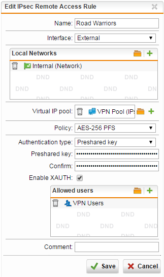 So, I am trying to set up an IPSec VPN connection on my Sophos UTM and use the Shrew Soft and I can get the client to connect, but I can't get any traffic across it. I have attached pic of my config from the UTM. I have also attached most of my Shew config. The issue that I am having is that I can't get any traffic across the tunnel. I noticed that when you set authentication type to PSK that the autocreate firewall rules disappeared. Can anyone help me find what I am missing? Should I have a firewall or NAT rule to go with this? Is there a good guide for this.