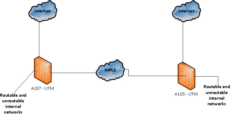 • Each depicted branch would like to access the "unroutable" subnets of the other branch (i.e. A107 would like to access unroutable subnets in A105 & vice versa). Source address would be from MPLS routable subnet of one branch and the destination subnet would be in unroutable subnet of the other plant.