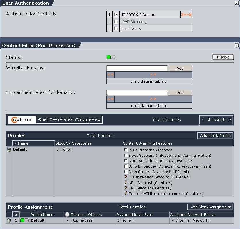 When an Active Directory/NT domain membership has been set up under System >> User Authentication, you can select this option here. This has the effect that NTLM user authentication will be used to authenticate clients. This is only guaranteed to work with Internet Explorer. Other browsers may support NTLM authentication too when they are run on a Windows system. To be able to use the proxy, a user MUST be in a group called "http_access" in the domain.