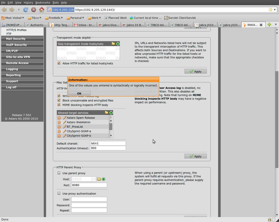 Trying to add a target service to browse to. Have done this before without problem now when adding a new definition to the allowed target part of web security get - 'One of the values you entered is syntactically or logically incorrect.'