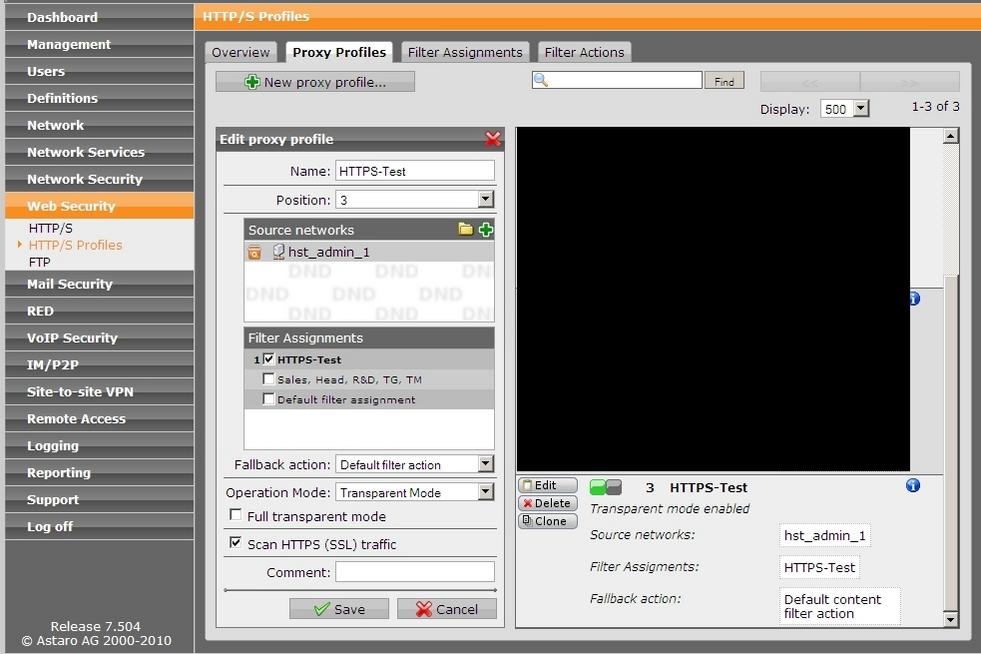 • OK, that looks like it confirms that hst_admin_1 is the subnet 10.x.25.0/24.  If you can confirm that you have 'Scan HTTPS (SSL) traffic' selected in the "HTTPS-Test" profile, then I agree that you've uncovered a "feature" of the Transparent mode.  What if you put the profile into "Standard" mode and point your browser at the Proxy?