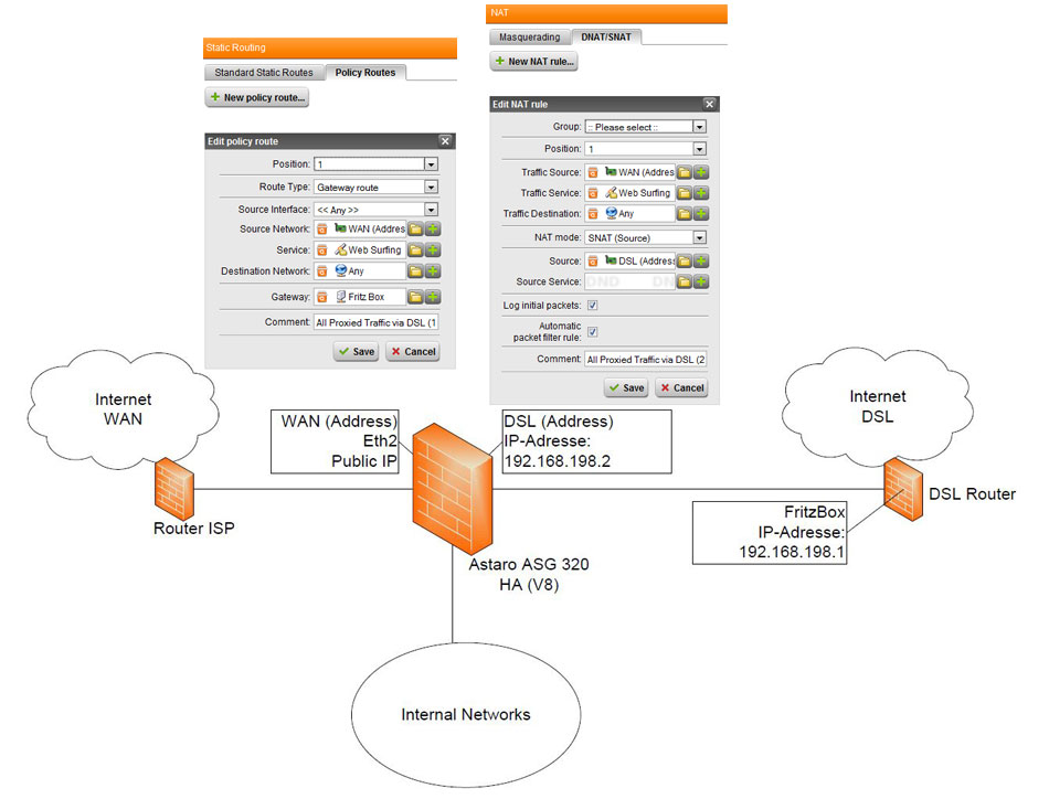 we configured our Astaro V8 to send all proxied traffic to our DSL Router, which is connected to a dedicated Interface (please take a look at the attachment).